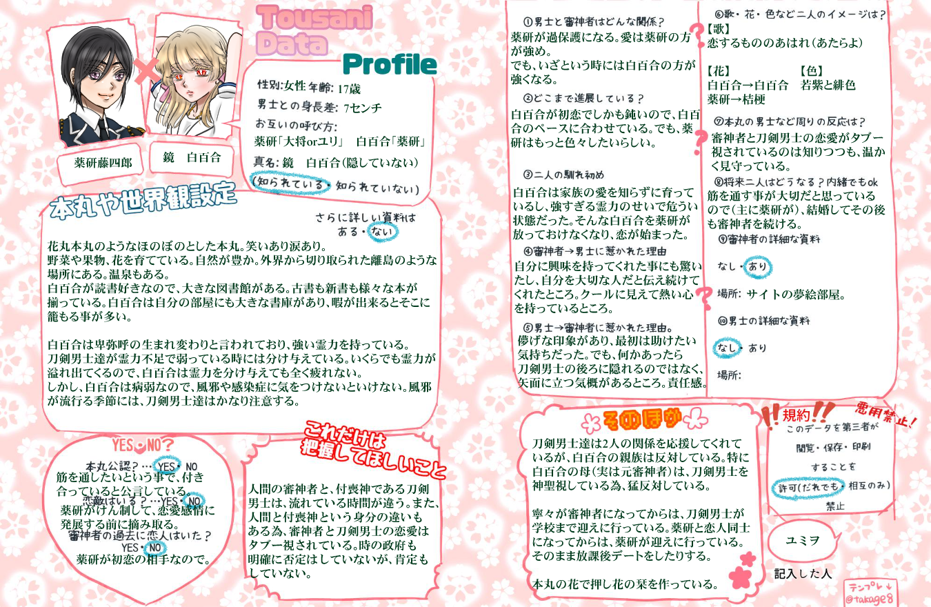 病弱ということもあり、薬研が特に気にかけてくれている。いつしか薬研から好意を向けられるようになるが、白百合は恋愛に疎いので、その好意に気づいたのは大分後になる。