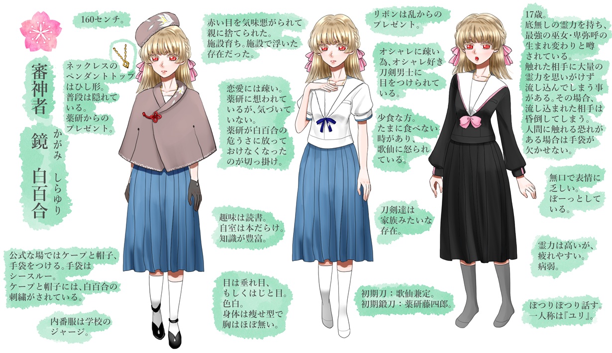 最強の巫女と謳われる卑弥呼の生まれ変わりと言われるほど、強い霊力を持つ。しかし、無意識に触れた人間に霊力を流し込んでしまう。その相手を昏倒させてしまう為、素手で人間に触れないようにしている。審神者になる前は、手袋が欠かせなかった。